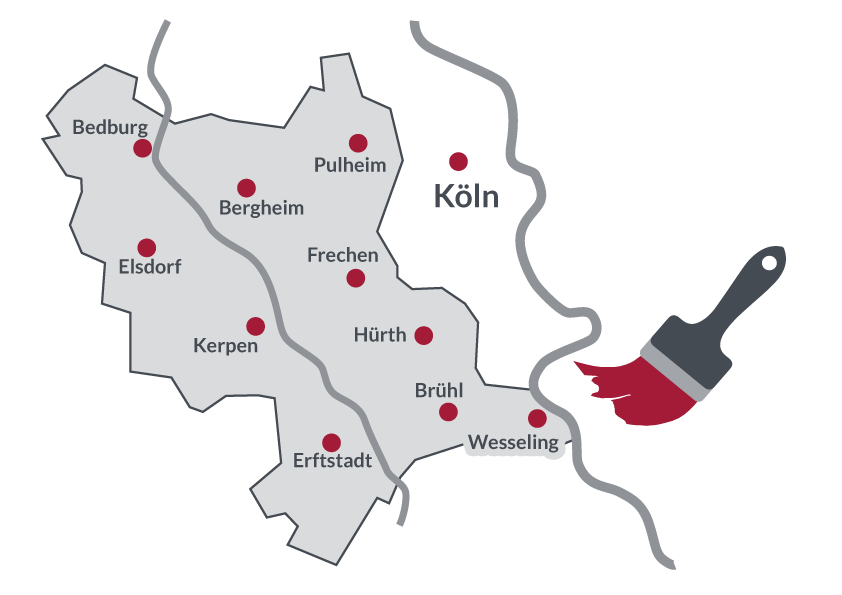 Die Malerfirma Ambiente, mit Sitz in Bergheim und Frechen-Königsdorf, ist Ihr Ansprechpartner für kreative Innen- und Außengestaltung in den Räumen Köln, Rhein-Erft-Kreis und Umland bis zu 100 km (z.B. Frechen, Pulheim, Brauweiler, Dansweiler, Glessen, Widdersdorf, Kerpen, Horrem, u.v.m.).